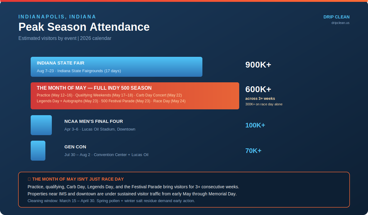 Indianapolis hosts the NCAA Men’s Final Four at Lucas Oil Stadium from April 3–6, drawing 100,000 visitors and national television coverage to the downtown core. Then comes the Month of May — and it’s not just race day. Practice opens at the Indianapolis Motor Speedway in mid-May, followed by two qualifying weekends, the Carb Day concert, Legends Day, the 500 Festival Parade through downtown, and finally the race itself on May 24 with more than 300,000 fans. All told, the Month of May brings an estimated 600,000 visitors to central Indiana over three-plus consecutive weeks. Gen Con fills 70,000 hotel rooms at the end of July, and the Indiana State Fair runs 17 days in August with over 900,000 attendees.