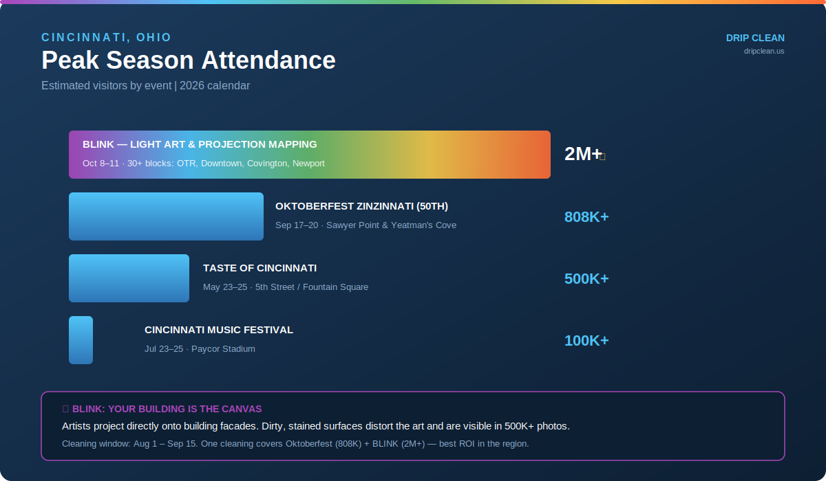 Cincinnati sees Taste of Cincinnati draw 500,000 over Memorial Day weekend, followed by the Cincinnati Music Festival in late July. But the real crescendo comes in September and October: Oktoberfest Zinzinnati celebrates its 50th anniversary September 17–20 with an expected 800,000 attendees, and just three weeks later, BLINK — the nation’s largest light art and projection mapping festival — transforms 30 city blocks into an outdoor art gallery for more than two million visitors.