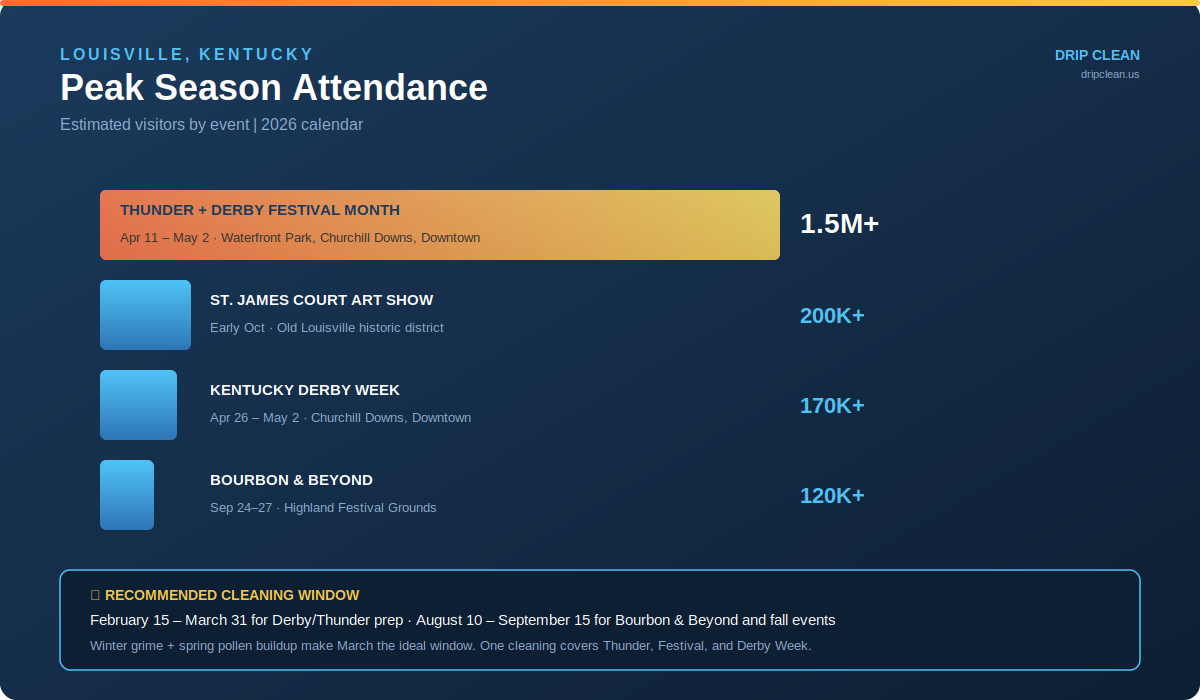 Louisville kicks off with Thunder Over Louisville on April 18 — the largest annual fireworks display in North America — followed immediately by two weeks of Kentucky Derby Festival events leading to Derby Day on May 2. That single month will bring an estimated 1.5 million visitors to the downtown corridor, Waterfront Park, and surrounding neighborhoods. Later in the year, Bourbon & Beyond (September 24–27) draws over 100,000 to the Highland Festival Grounds, and the St. James Court Art Show in early October puts 200,000 pairs of eyes on Old Louisville’s historic architecture.