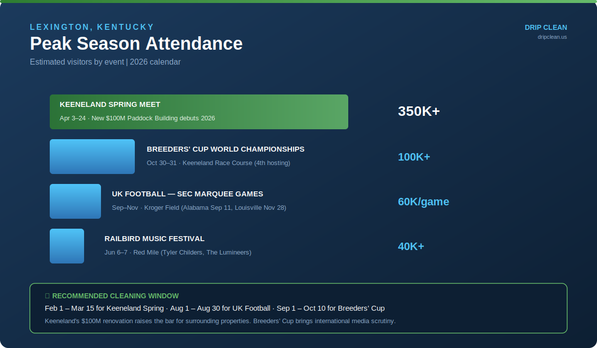 Lexington opens Keeneland’s Spring Meet on April 3, debuting a brand-new $100 million Paddock Building alongside 15 days of premier thoroughbred racing. The Railbird Music Festival brings 40,000 fans to Red Mile in June, UK Football’s SEC schedule fills 61,000-seat Kroger Field every Saturday in the fall, and the Breeders’ Cup World Championships return to Keeneland October 30–31 with international media and horse racing’s most prestigious visitors.